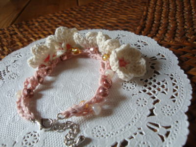 ビーズを編みこんだ、かぎ針編みのくさりに、