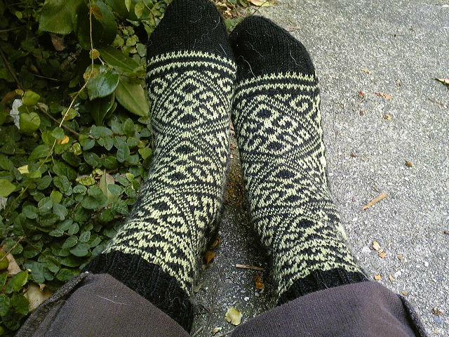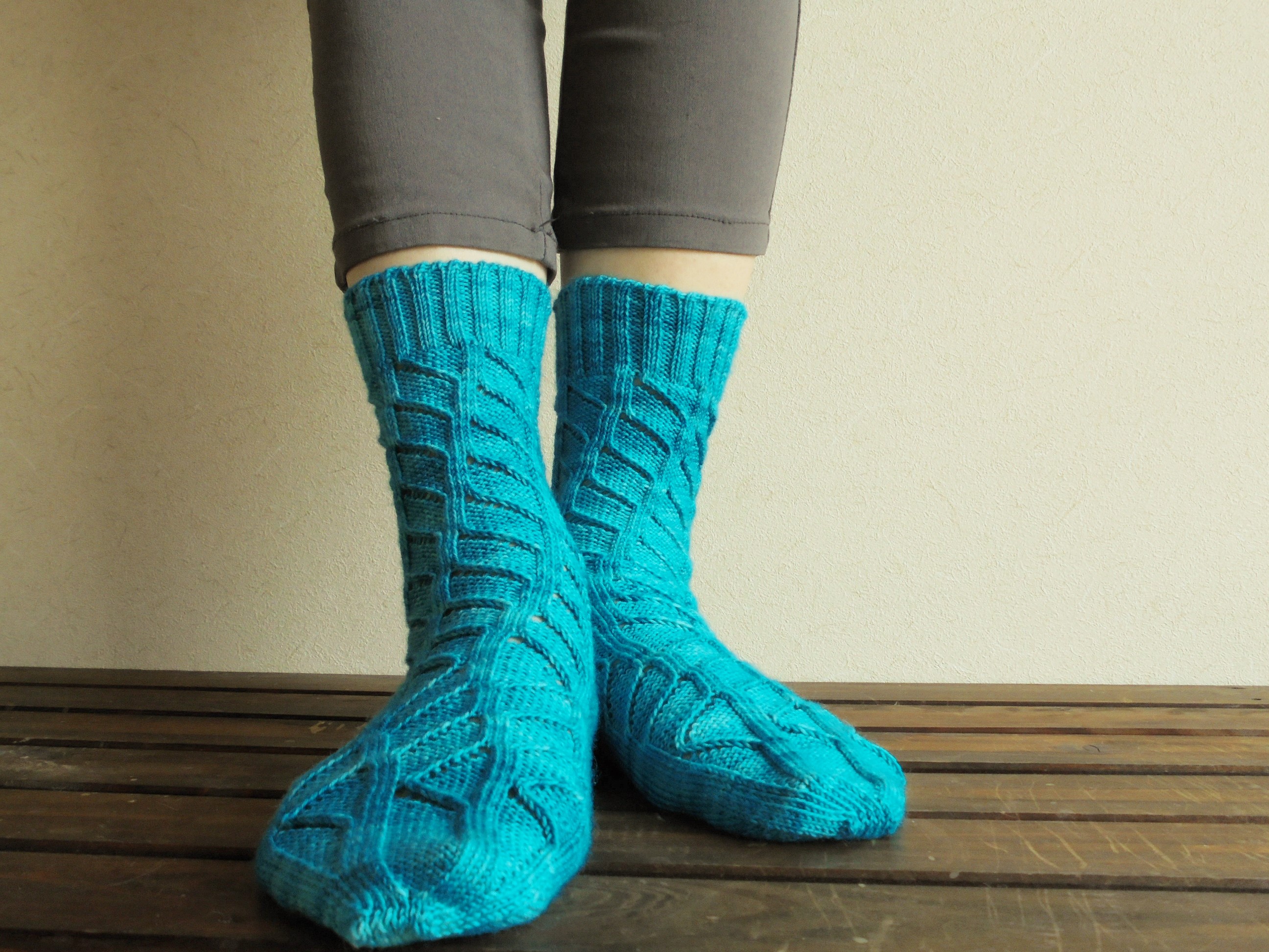 履き口から下へ編むので、目の形が逆Vになって、