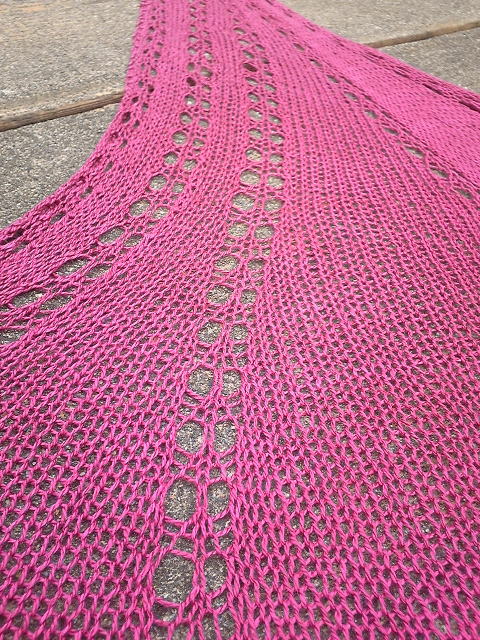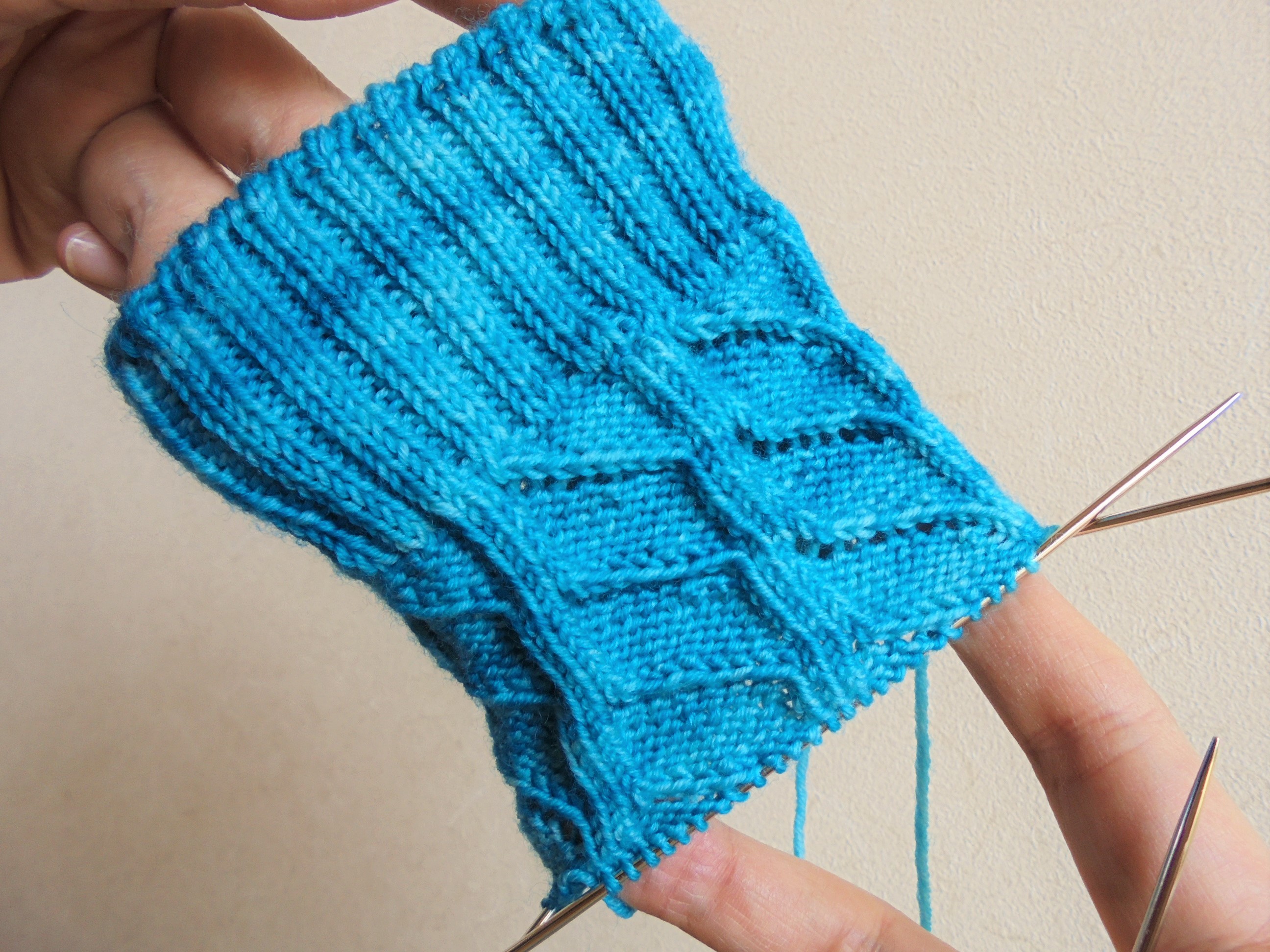 このパターンは表目に見えるのは全部ねじり目、2目一度もねじりながら、というけっこう過酷な編み方でしたが、しっかり撚りがかかっているので、糸割れすることもなくきれいに編めました。