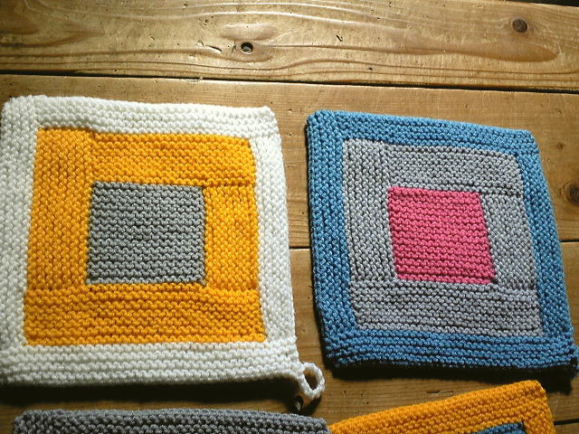 5色1玉ずつ使い、色の組み合わせをいろいろ変えて8枚編めました。