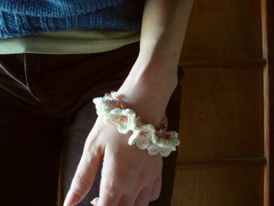 ビーズを編みこんだ、かぎ針編みのくさりに、