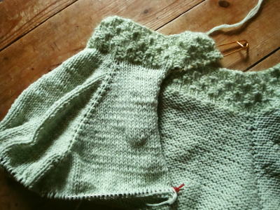 身頃編み終わって袖に入ったあたりで、だいぶ失速しましたけど。飽きちゃって。