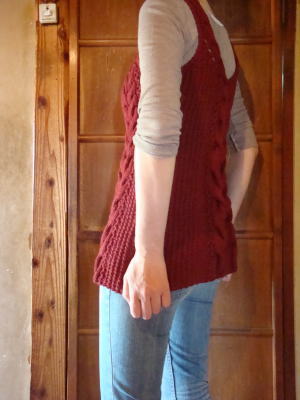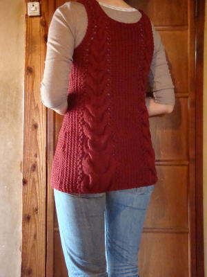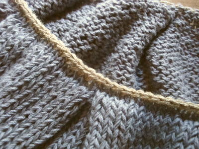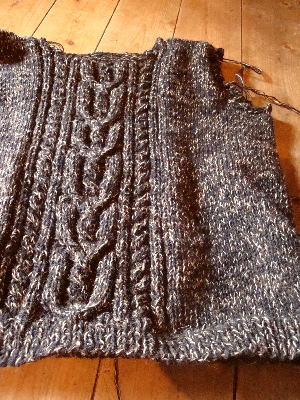 こっちの身頃の襟ぐり、オリジナルより8段(=縄編み1つ分)多く開けてます。