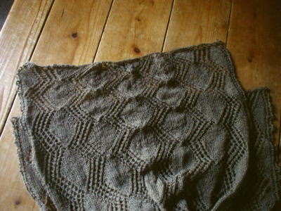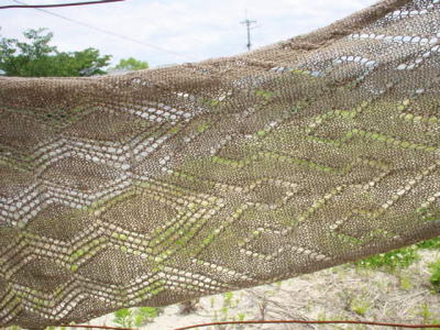 編んだ後、透かし模様を出すために、伸ばし気味にスチーム当ててブロッキングするんだけど、