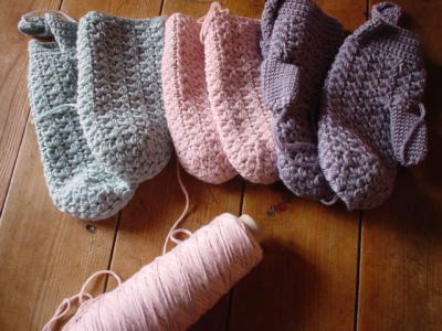 (オリジナルパターンのかぎ針編みミトン、ラブリーな色で量産中。