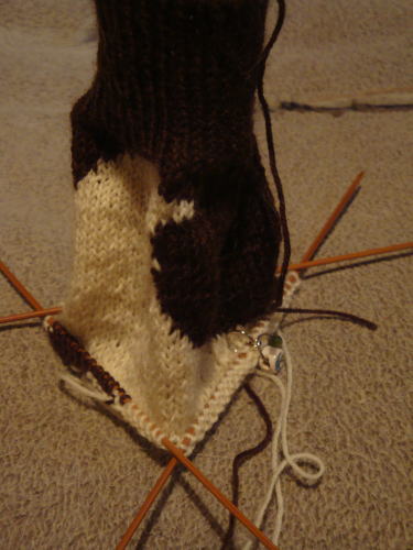 かかと側。(intesiaを輪で編むやり方だと、どうしても後ろにシームみたいなのができちゃうんだけど、