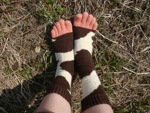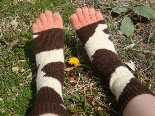 靴下KAL2012のお題のひとつ、牛柄5本指ソックスです。
